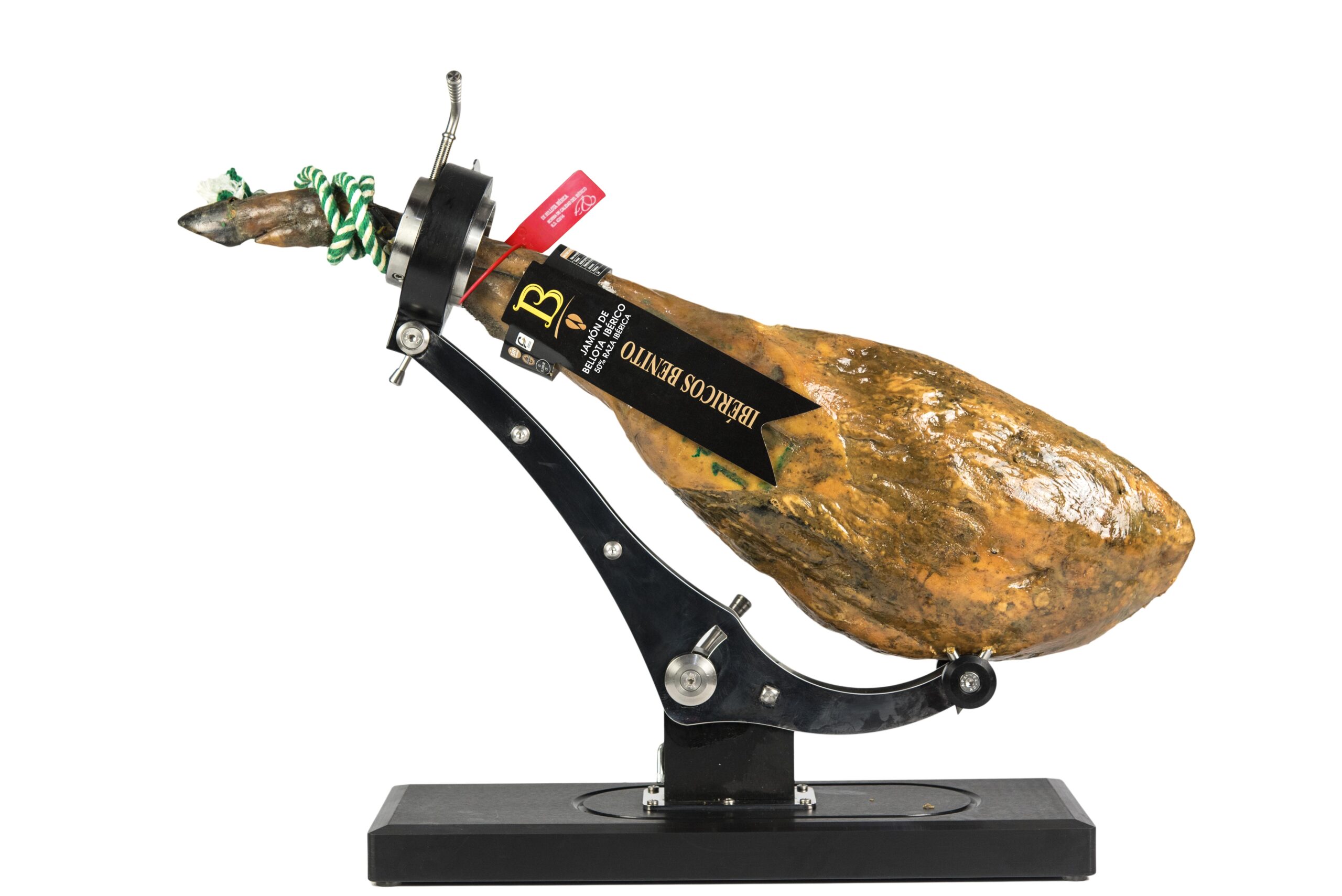 Cada pieza lleva el crotal de color rojo que certifica su categoría de 50% ibérico de bellota según la normativa vigente de calidad del ibérico.
