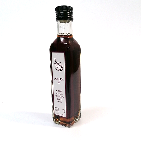 Vinagre D.O. Jerez. 250 ml. botella «marasca» (base cuadrada). Ideal para aderezos. Envejecimiento superior a 6 meses.